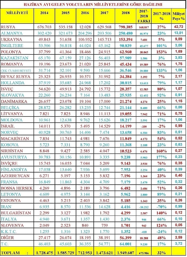 Antalya'ya en fazla turist sırasıyla Rusya, Almanya, Ukrayna'dan geldi. Bu üç pazardan gelen toplam turist sayısının yüzde 66'sını oluşturdu. Bu ülkeleri İngiltere, Polonya, Kazakistan ve Romanya takip etti.