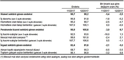 Mevsim etkilerinden arındırılmış hizmet sektörü güven endeksi Kasım ayında 99.7 iken, Aralık ayında % 3.5 oranında azalarak 96.2 değerine düştü.