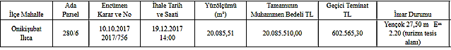 İhaleye konu olan arazi için 20 milyon 085 bin lira tahmini satış bedeli, 602 bin 565 lira da geçici teminat tutarı belirlendi.