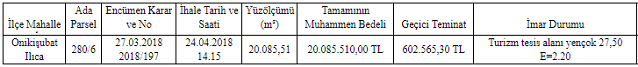 Kahramanmaraş’ın Oniki Şubat İlçesi’nde yer alan 20 bin metrekare büyüklüğündeki turizm tesis alanı ihaleye çıkarıldı. İhalenin muhammen bedeli 20 milyon 85 bin, geçici teminat bedeli ise 602 bin 565 TL olarak açıklandı.