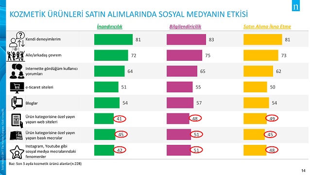Teknoloji ve moda kadar satış oranları son yıllarda oldukça artış gösteren bir diğer alan olan kozmetik ürünlerine gelindiğinde, tüketicilerin influencer’ları bu kategoride daha çok dikkate aldığı görülüyor. Youtube, Instagram gibi platformlarda kozmetik alanlarında içerik üreten ve tanıtım yapan influencer’lar tüketiciler tarafından %42 oranında inandırıcı bulunuyor. Kozmetik ürünler hakkında yayın yapan web siteleri ve diğer sosyal medya platformlardaki basın ise %41’lik az bir farkla geride kalıyor. Influencer’lar kozmetik ürünlere %48’lik dikkat çekici bir oranla satın almaya yönlendirirken, basın mensupları ve yayınlar %46 oranında satın almaya ikna ediyor.