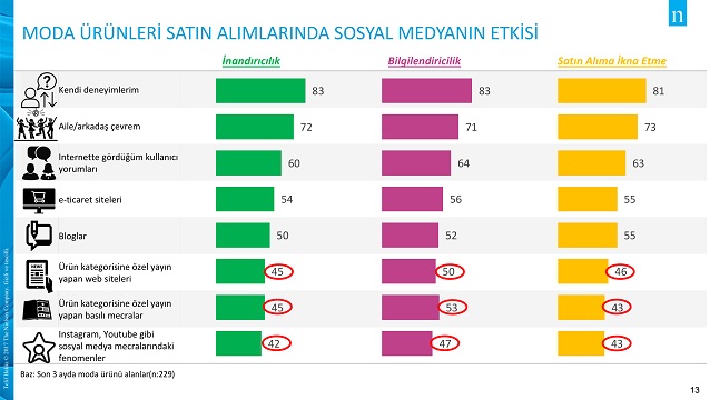 Tüketiciler farklı bir kategori olan moda ürünlerini satın almadan öncesinde ürün hakkında araştırma yaparken, bu kategoride yayın yapan mecraları önemsiyor. Tüketiciler; moda dergileri, web siteleri ve gazetelerin moda bölümlerini %45 oranında inandırıcı buluyor. Aynı durumun influencer’lara gelindiğinde ise %42 olduğu görülüyor. Sosyal medya kullanıcılarını satın almaya ikna eden tarafın ise %46 ile moda basını olduğu dikkat çekiyor. Influencer’ların satın almaya etkisinin moda konusunda %43 ile teknoloji alanında yaptıkları tanıtımlardan daha fazla olduğu gözlemleniyor.