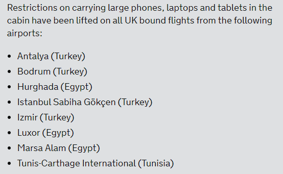 İngiltere Dışişleri Bakanlığı’nın internet sitesinden yaptığı duyuruya göre, İngiltere, Türkiye, Mısır ve Tunus’tan gelen çoğu uçuştaki elektronik eşya yasağını kaldırdı.