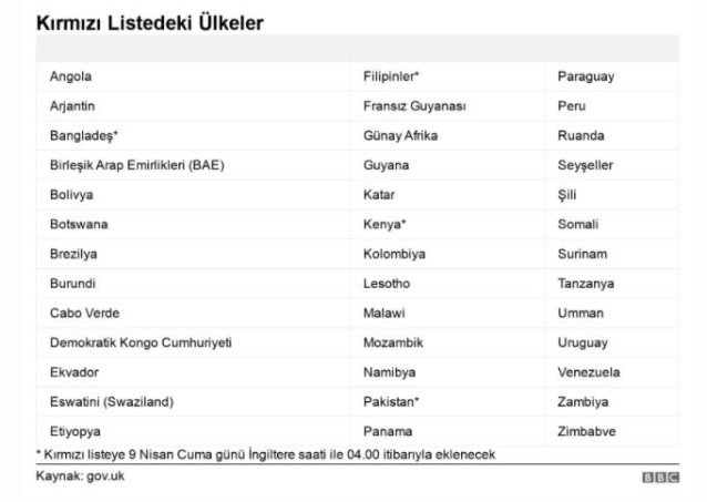 BBC'ye bilgi veren İngiltere hükümet kaynakları, Türkiye ile ilgili mevcut düzenlemelerde herhangi bir değişiklik yapılmadığını ve "kırmızı listeye" dahil edilmesine dair şu aşamada bir çalışma olmadığını söyledi.