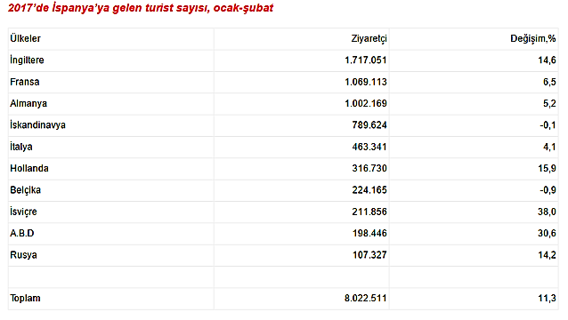 İspanya turizmi 2017 yılında yüksek oranlı büyümesine devam ediyor. Ülke 2 ayda % 11.3 büyüme oranıyla 8 milyon turisti ağırladı.