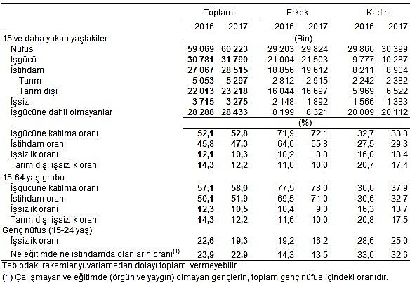 İşgücü 2017 yılı Kasım döneminde bir önceki yılın aynı dönemine göre 1 milyon 9 bin kişi artarak 31 milyon 790 bin kişi, işgücüne katılma oranı ise 0.7 puan artarak % 52.8 olarak gerçekleşti. Aynı dönemler için yapılan kıyaslamalara göre; erkeklerde işgücüne katılma oranı 0.2 puanlık artışla % 72.1, kadınlarda ise 1.1 puanlık artışla % 33.8 olarak gerçekleşti.