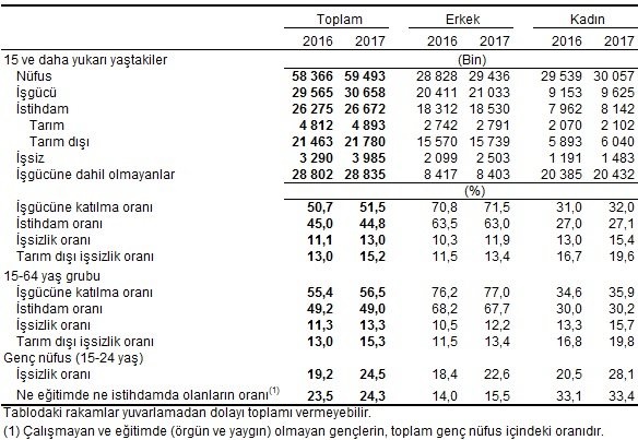 İşgücü 2017 yılı Ocak döneminde bir önceki yılın aynı dönemine göre 1 milyon 93 bin kişi artarak 30 milyon 658 bin kişi, işgücüne katılma oranı ise 0,8 puan artarak yüzde 51,5 olarak gerçekleşti. Aynı dönemler için yapılan kıyaslamalara göre erkeklerde işgücüne katılma oranı 0,7 puanlık artışla yüzde 71,5, kadınlarda ise 1 puanlık artışla yüzde 32 olarak gerçekleşti.