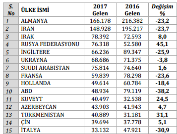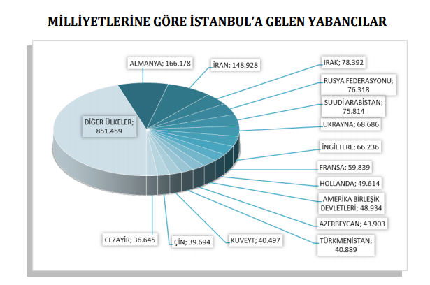 Almanlar: %8.8, İranlılar: % 7.9, Iraklılar: %4.1, Ruslar: %4.0, Suudi Arabistanlılar: %4.0, Ukraynalılar: %3.6, İngilizler: %3.5, Fransızlar:%3.2, Hollandalılar: %2.6, Amerikalılar: %2.6, Azerbaycanlılar: %2.3, Türkmenler: %2.2, Kuveytliler: %2.1, Çinliler: %2.1, Cezayirliler: %1.9, Diğer ülkeler: %45.0.