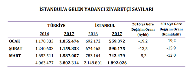 İstanbul İl Kültür ve Turizm Müdürlüğü’nün açıkladığı verilere göre 2017 yılının Mart ayında İstanbul’a gelen ziyaretçi sayısı bir önceki yılın aynı ayına göre % 5.2 oranında azalarak 742 bin seviyesine geriledi. 2016 yılının Mart ayında İstanbul’a gelen turist sayısı 783 bin seviyesindeydi.