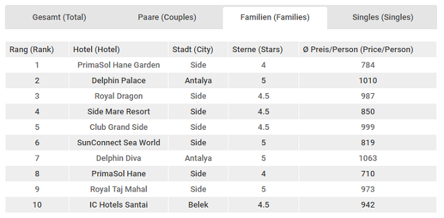 Alman aileler tarafından en çok tercih edilen Türkiye otelleri sıralamasında ilk üç şu şekilde gerçekleşti. İlk sırada, geçtiğimiz dönemin üçüncüsü PrimaSol Hane Garden yer aldı. Alman aileler tarafından en çok tercih edilen ikinci otel Delphin Palace oldu. Üçüncü sırada ise Royal Dragon yer aldı.