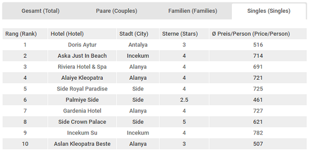 Alman tek seyahat eden turistlerin tercih ettiği otel sıralamasında ise ilk sırada geçtiğimiz dönem dördüncü sırada yer alan Doris Aytur yer alırken; bir önceki dönemin birincisi Aska Just in Beach ikinci sıraya geriledi. Üçüncü otel ise Riviera Hotel Spa oldu.