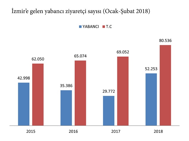 ETİK'in özel yönetim raporlarının 46. sayısında İzmir turizminin 2018 yılının Şubat ayı analizine yer verildi. Rapora göre, İzmir turizmi, 2018 yılının iki aylık döneminde, yabancı ziyaretçi sayısını yüzde 75.5 artırdı. Yurt dışından gelen vatandaş ziyaretçi de yüzde 16,6 yükseldi. İzmir turizmi 2018 yılı Ocak - Şubat döneminde 52 bin 253 yabancı ziyaretçi ağırladı. Bu dönemde 80 bin 536 vatandaş ziyaretçi ağırlandı. Böylece İzmir, toplamda yüzde 34.4 artışla 132 bin 789 ziyaretçi çekmiş oldu.