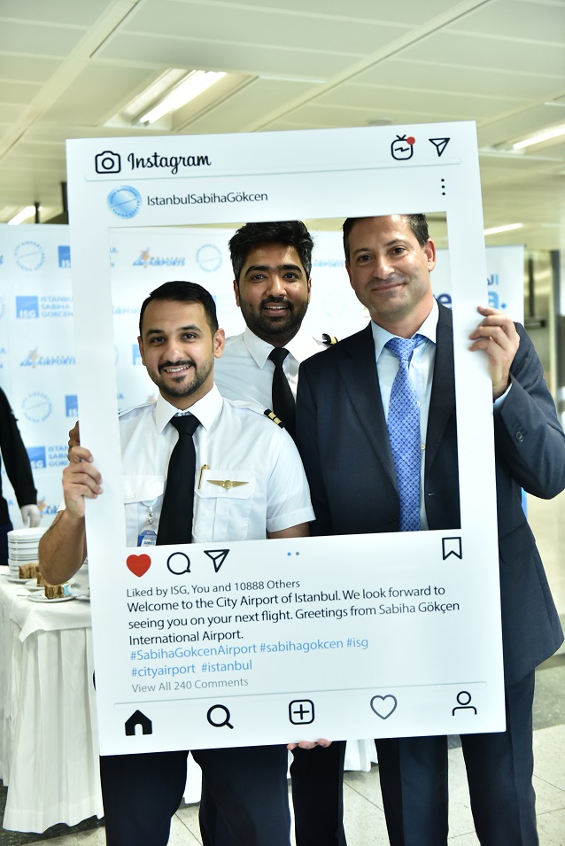 Jazeera Airways’in ilk seferi sebebiyle Sabiha Gökçen Havalimanı’nda bir karşılama töreni gerçekleştirildi. Daha sonra ilk uçuş sebebiyle düzenlenen karşılama töreninde, İSG yöneticileri uçağın Jazeera yöneticilerini ve kabin ekibini çiçek vererek karşıladılar. Apronda su takı ile karşılanan uçaktan inen yolcular için bir kokteyl düzenlenirken, ilk uçuş için geleneksel pasta kesimi yapıldı. İSG Yönetim Kurulu Üyesi Dato Azmi Bin Murad, Ticari Havacılık Direktörü Gerald Ong, Jazeera Airways Doğu Akdeniz Ülkeleri ve Avrupa Bölge Müdürü Bernard Matta, Maple Aviation CEO’su Fehime Kaya ve Jazeera Airways üst düzey yetkilileri ile ilk uçuşta bulunan yolcuların katıldığı kokteylde misafirlere özel olarak hazırlanmış lokumlar ikram edildi. Kokteyl sırasında İSG Yönetim Kurulu Üyesi Dato Azmi Bin Murad tarafından Jazeera Airways Doğu Akdeniz Ülkeleri ve Avrupa Bölge Müdürü Bernard Matta’ya ilk uçuşun anısına hazırlanan bir hediye takdim edildi.
