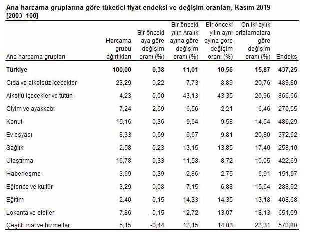 Tüketici Fiyatları Endeksi'nde (TÜFE) 2019 yılı Kasım ayında bir önceki aya göre %0,38, bir önceki yılın Aralık ayına göre %11,01, bir önceki yılın aynı ayına göre %10,56 ve on iki aylık ortalamalara göre %15,87 artış gerçekleşti.