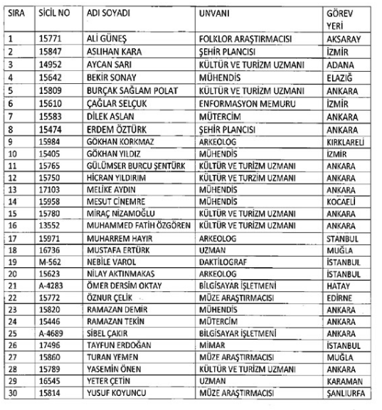 KHK kapsamında görevden ihraç edilen Kültür ve Turizm Bakanlığı çalışanlarının listesi şu şekilde: