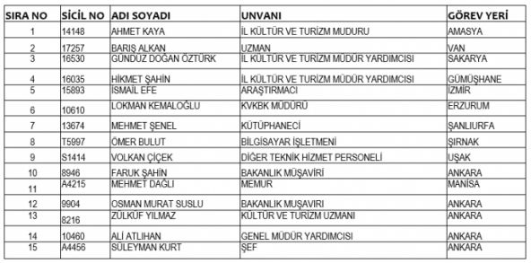 Göreve iade edilen Kültür ve Turizm Bakanlığı personelinin listesi ise şu şekilde: