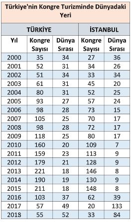 * Türkiye’de 2000’lerin başından itibaren büyümeye başlayan kongre turizmi 2013 yılına kadar gelişimini sürdürdü. Rekor yılı olan 2013’te, 146’sı İstanbul’da olmak üzere Türkiye’de toplam 221 uluslararası toplantı düzenlendi. Türkiye, dünya sıralamasında 18. sırada yer aldı. Şehir bazında ise İstanbul 146 kongre ile 8. sırayı aldı. 2016 yılı itibariyle maalesef Türkiye ülke bazında ilk 20’deki, İstanbul şehir bazında ilk 10’daki yerlerini kaybetti.