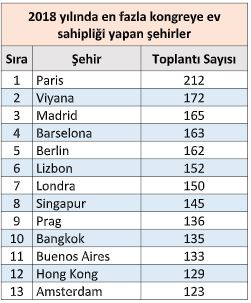 * 2018 yılında şehir bazında ilk sıraya Paris yerleşti. İstanbul 33 kongre ile 84. sırada, Antalya 12 kongre ile 225. sırada yer buldu.