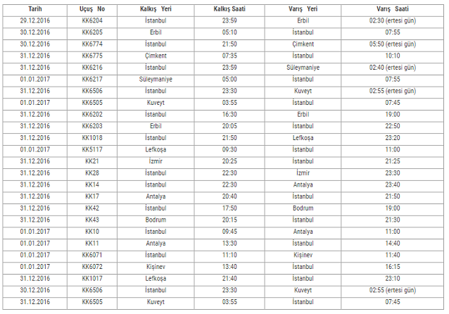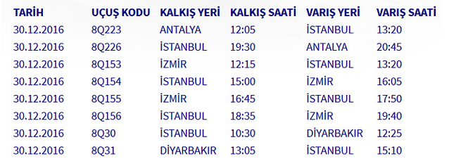 İstanbul Sabiha Gökçen ve İstanbul Atatürk havalimanlarında beklenen kar yağışı nedeniyle, havaalanı otoritesinin trafik kısıtlama kararına paralel olarak 30 Aralık Cuma ve 31 Aralık Cumartesi günlerinde aşağıdaki seferlerimiz iptal edildi.