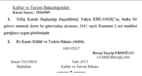 HaberlerEklenme Tarihi: 11.01.2017 09:12 Kültür ve Turizm Bakanlığı’nda görev değişikliği Resmi Gazete’de yayımlanan karara göreve Kültür ve Turizm Bakanlığı bünyesinde bir görev değişikliği yaşandı. 0 Roma Kolezyumu’ndan sonra bu kez Berlin Museuminsel’de... Bugünkü Resmi Gazete’de yayımlanan karara göre Kültür ve Turizm Bakanlığı Teftiş Kurulu Başkanlığı Başmüfettişi Yahya Kırlangıç başka bir göreve alınmak üzere görevden alındığı belirtildi. Bugünkü Resmi Gazete'de yayımlanan ilgili karar şu şekilde: Kültür ve Turizm Bakanlığı atama görevden alınma görev değişikliği Yorum yapmak için tıklayın Yorum Yap 0/500 Yorum yazma kurallarını okudum ve kabul ediyorum. Yorum Gönder Yorumlar (0) Daha fazla yorum yükle ÇOK OKUNANLAR Bilet Dükkanı'nda işten çıkarmalar başladı 1 Turizm sektörü tekelleşiyor 2 Epstein dosyasında ismi geçen Rixos’tan açıklama geldi: Gerçeği yansıtmıyor, itibar etmeyin 3 2026 yılı güncel Müzekart fiyatları 4 TÜRSAB’dan seyahat acentacılığı ve tur operatörlüğü eğitimi 5 Elite World, TIF 2026’da franchise büyüme modelini dünyaya tanıtacak 6 Hazine arazisine yapılacak 5 yıldızlı otel projesi yeniden ÇED sürecinde 7 Tamince’den Epstein iddialarına yanıt: Talep Dubaili iş insanından geldi! 8 Corendon Airlines, Brand & Sports Summit’te sporda oyunu değiştiren yaklaşımını paylaşta 9 Düzce Merkez’e 4 yıldızlı otel geliyor 0