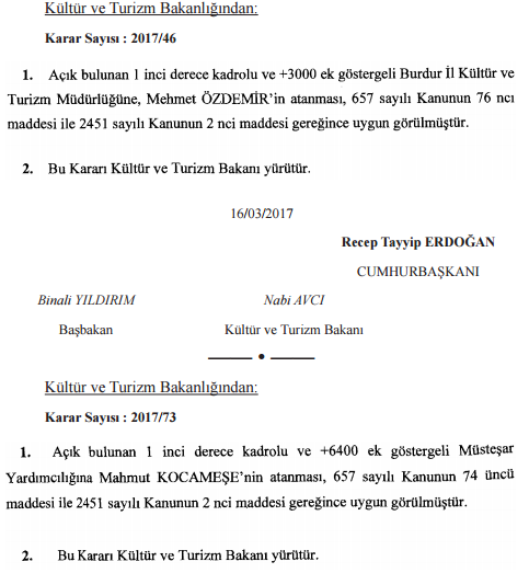 Kültür ve Turizm Bakanlığı bünyesinde gerçekleşen bir diğer atama kararına göre ise açıkta bulunan Burdur İl Kültür ve Turizm Müdürlüğü görevine Mehmet Özdemir atandı.