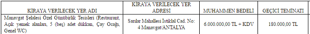 Manavgat Şelalesi Özel Günübirlik Tesisleri (Restaurant, Açık yemek alanları, 5 (beş) adet dükkan, Çay Ocağı, Genel WC) Kiralama İhalesi 5 Yıllık (60 aylık) 2886 Sayılı Devlet İhale Kanununun 35/a maddesi gereğince Kapalı teklif (Arttırma) usulü ile ihale edilecektir.