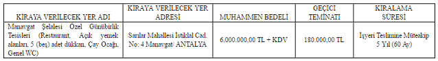 Manavgat Şelalesi Özel Günübirlik Tesisleri (Restaurant, Açık yemek alanları, 5 (beş) adet dükkan, Çay Ocağı, Genel WC) Kiralama İhalesi 5 Yıllık (60 aylık) 2886 Sayılı Devlet İhale Kanununun 35/a maddesi gereğince Kapalı teklif (Arttırma) usulü ile ihale edilecektir.