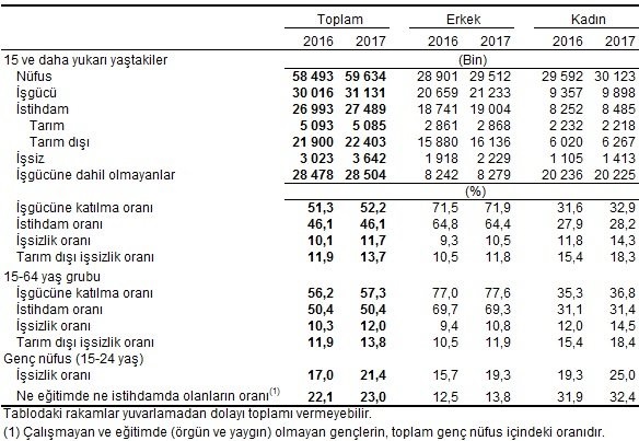 İşgücü 2017 yılı Mart döneminde bir önceki yılın aynı dönemine göre 1 milyon 115 bin kişi artarak 31 milyon 131 bin kişi, işgücüne katılma oranı ise 0.9 puan artarak % 52.2 olarak gerçekleşti. Aynı dönemler için yapılan kıyaslamalara göre; erkeklerde işgücüne katılma oranı 0.4 puanlık artışla % 71.9, kadınlarda ise 1.3 puanlık artışla % 32.9 olarak gerçekleşti.