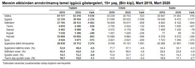 TÜİK'in açıkladığı verilere göre, Türkiye genelinde 15 ve daha yukarı yaştakilerde işsiz sayısı 2020 yılı Mart döneminde geçen yılın aynı dönemine göre 573 bin kişi azalarak 3 milyon 971 bin kişi oldu. İşsizlik oranı 0,9 puanlık azalış ile %13,2 seviyesinde gerçekleşti. Tarım dışı işsizlik oranı 1,1 puanlık azalış ile %15,0 oldu.