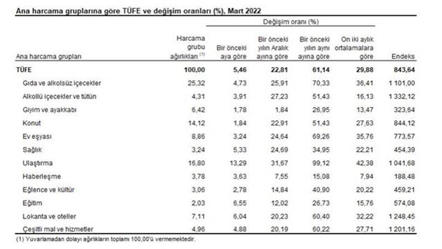 TÜFE'de 2022 yılı Mart ayında bir önceki aya göre %5,46, bir önceki yılın Aralık ayına göre %22,81, bir önceki yılın aynı ayına göre %61,14 ve on iki aylık ortalamalara göre %29,88 artış gerçekleşti. Yıllık en düşük artış %15,08 ile haberleşme ana grubunda gerçekleşti. Bir önceki yılın aynı ayına göre artışın düşük olduğu diğer ana gruplar sırasıyla %26,73 ile eğitim, %26,95 ile giyim ve ayakkabı ve %34,95 ile sağlık oldu. Buna karşılık, bir önceki yılın aynı ayına göre artışın yüksek olduğu ana gruplar ise sırasıyla, %99,12 ile ulaştırma, %70,33 ile gıda ve alkolsüz içecekler, %69,26 ile ev eşyası oldu.