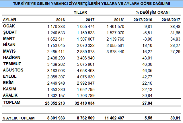 Emniyet Genel Müdürlüğü'den alınan geçici verilere göre; 2018 yılı Mayıs ayında ülkemizi ziyaret eden yabancı sayısı geçen yılın aynı ayına göre %27,29 oranında artarak 3 678 440 oldu. Gelen yabancı ziyaretçinin yüzde 1.05 (38 777) günübirlikçi ziyaretçilerden oluştu.