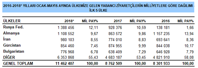 Mayıs ayında ülkemize en çok ziyaretçi gönderen ülkeler sıralamasında Rusya Fed. %23,49 (864 087) ile birinci, Almanya %11,88 (436 887) ile ikinci, İngiltere (Birleşik Krallık) %7,43 (273 203) ile üçüncü sırada yer aldı. İngiltere'yi Gürcistan ve Bulgaristan izledi. İlk 5 aylık ortalamada ise Rusya Fed. %12,11 (1 388 456) ile birinci, Almanya %9,67 (1 108 552) ile ikinci, İran %8,55 (980 103) ile üçüncü sırada yer aldı.