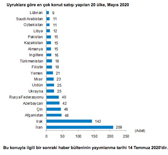 Mayıs ayında İran vatandaşları Türkiye'den 209 konut satın aldı. İran'ı sırasıyla, 143 konut ile Irak, 48 konut ile Afganistan, 46 konut ile Çin ve 42 konut ile Azerbaycan izledi.