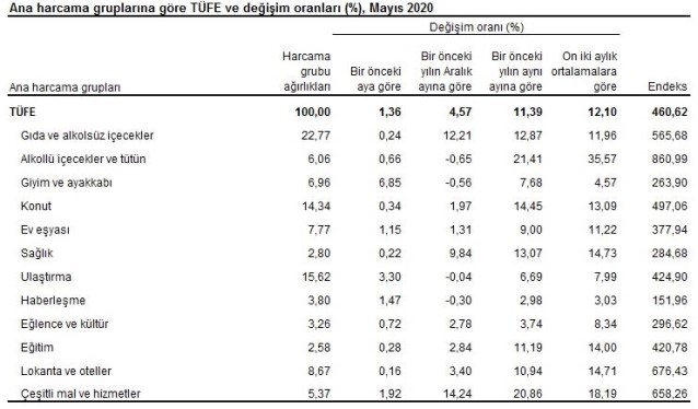 Tüketici Fiyat Endeksi'nde(TÜFE) 2020 yılı Mayıs ayında bir önceki aya göre %1,36, bir önceki yılın Aralık ayına göre %4,57, bir önceki yılın aynı ayına göre %11,39 ve on iki aylık ortalamalara göre %12,10 artış gerçekleşti.