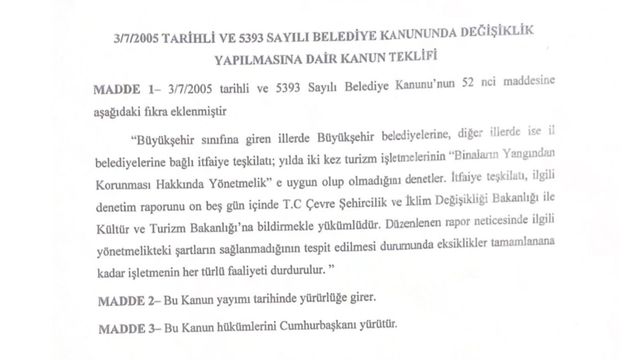 “Ülkemizde bulunan tüm turizm işletmelerinin periyodik olarak yılda iki kez ‘Binaların Yangından Korunması Hakkında Yönetmelik’ uyarınca denetlenmesi, denetim raporlarının Çevre, Şehircilik ve İklim Değişikliği Bakanlığı ile Kültür ve Turizm Bakanlığı’na on beş gün içerisinde bildirilmesi, gerekli şartları sağlamayan işletmelerin de eksiklikler tamamlanana kadar kapatılmalarını öngören kanun teklifimizi TBMM’ye sunduk.”