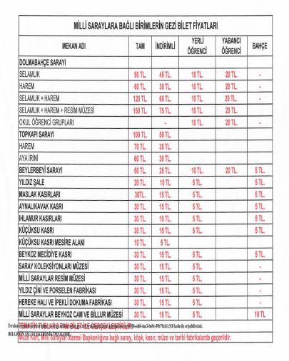 Milli Saraylar İdaresi Başkanlığı, saray, köşk, kasır, müze ve tarihi fabrikalarda uygulanacak gezi bilet ücretleriyle ilgili yeni tarifeyi yayınladı. Yeni tarifeye göre müzelere Tam giriş ücreti aynı tutulurken indirimli girişlerde indirim oranı artırıldı. Yerli ve yabancı öğrenciler için giriş ücreti belirlendi. Yerli öğrenciler yabancı öğrencilere göre müzelere yarı yarıya ucuza ziyaret edebilecek. Milli Saraylar'a bağlı yerlerin yeni bilet fiyat tarifesi şöyle:
