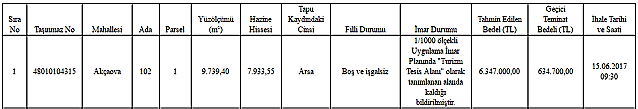 Bugünkü Resmi Gazete'de yayımlanan ilana göre, Muğla'nın Akçaova Mahallesi'nde bulunan 7 bin 930 metrekare büyüklüğündeki arazi ihale usulüyle satışa çıkarıldı. Muhammen bedeli 6 milyon 347 bin lira olarak belirlenen arazinin ihalesi 15 Haziran 2017 tarihinde yapılacak.