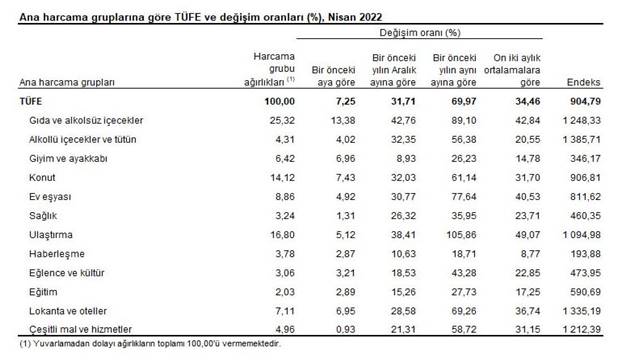 Tüketici Fiyat Endeksi(TÜFE) Nisan'da aylık yüzde 7.25, yıllık ise yüzde 69.97 arttı. TÜFE'de 2022 yılı Nisan ayında bir önceki aya göre %7,25, bir önceki yılın Aralık ayına göre %31,71, bir önceki yılın aynı ayına göre %69,97 ve on iki aylık ortalamalara göre %34,46 artış gerçekleşti.