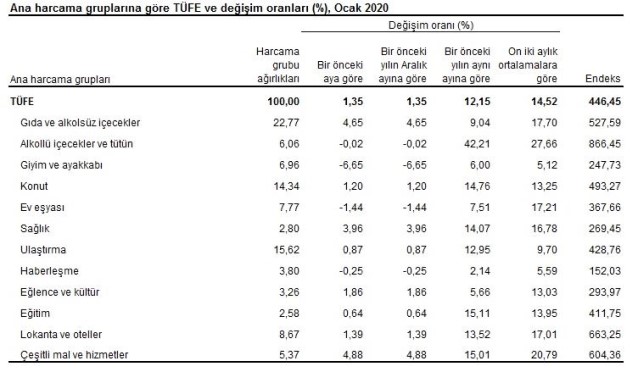 TÜİK'in açıkladığı istatistiklere göre Tüketici Fiyatları Endeksi(TÜFE) 2020 yılı Ocak ayında bir önceki aya göre %1,35, bir önceki yılın Aralık ayına göre %1,35, bir önceki yılın aynı ayına göre %12,15 ve on iki aylık ortalamalara göre %14,52 artış gerçekleşti.