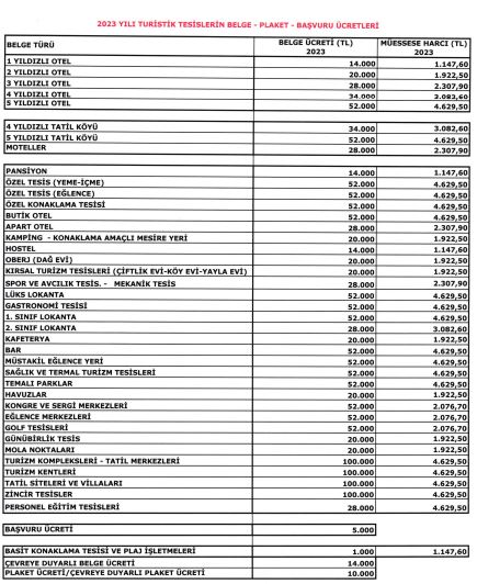 Kültür ve Turizm Bakanlığı Yatırım ve İşletmeler Genel Müdürlüğü 2023 yılı Turistik Tesislerin Belge, Plaket, Başvuru Ücretleri ve Müessese Harçlarını açıkladı.