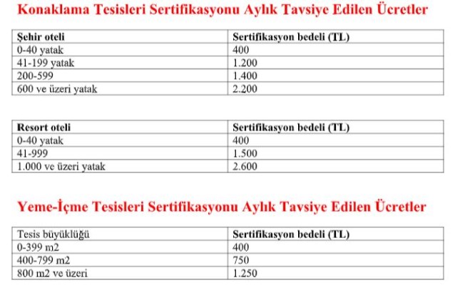 Belge verecek firmaların belirlenmesiyle sertifika programında yeni bir aşamaya daha geçildiğini belirten Eresin, uygulamanın tesisler açısından mecburi olmadığını, ancak hijyen ve Covid-19 önlemleri konusunda tüketici hassasiyetinin arttığı bir dönemde bu konularda önlemlerini alan işletmelerin öncelikle tercih edilmesini beklediklerini kaydetti. Eresin, otellerin ödeyeceği sertifika bedelinin bir kısmının sadece kendi üyeleri için geçerli olmak üzere, turizmin bütün fonksiyonları ile ülke yararına gelişmesini sağlamak ve bu doğrultuda üyelere destek olmak görev bilinci ile TÜROB tarafından karşılanabileceğini, bu konuda çalışmaların başlatıldığını belirtti. Eresin, sertifika bedelinin yatak kapasitesine göre aylık olarak 400 TL ile 2.600 TL arasında değiştiğine dikkat çekti. Türkiye Turizm ve Geliştirme Ajansı’nın web sitesinde sertifika vermeye yetkili kuruluşların isimlerinin ilan edildiğine işaret eden Eresin, tesislerin bu kuruluşlar ile irtibata geçebileceğini vurguladı. Eresin, gerekli yetkinliğe sahip başka kuruluşların da Türkiye Akreditasyon Kurumu (TÜRKAK) onayını almaları durumunda sertifika vermek üzere gereken kontrol ve denetimleri yapabileceğinin altını çizdi.