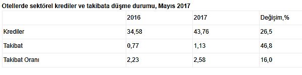 Turizmdatabank’ın BDDK verilerinden derlediği bilgilere göre, 2017 yılı Mayıs ayında otellerin bankalardan aldığı kredilerde takibata düşme oranı yüzde 2.23’ten yüzde 2.58’e çıktı.