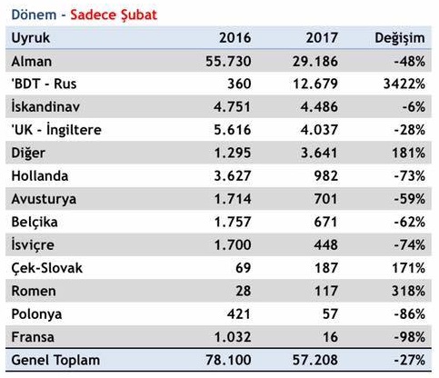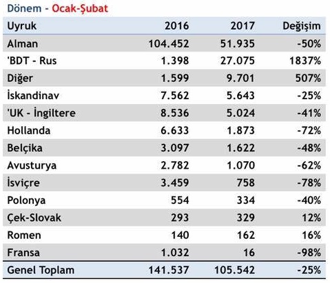 Almanya pazarında 2017 yılının ilk iki ayında % 50’lik bir düşüş yaşanırken; Şubat 2017 döneminde % 48’lik bir düşüş yaşandı. Hollanda pazarı da paket tur satışlarında önemli kayıpların yaşandığı bir diğer pazar oldu; yılın ilk iki ayında % 72’lik bir düşüş yaşandı.