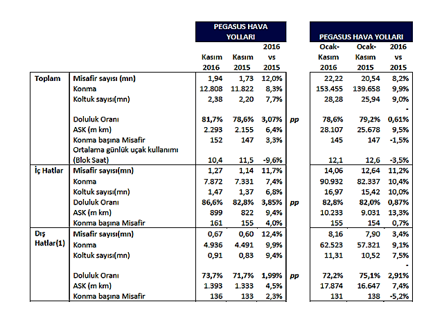 Pegasus Hava Yolları, 2016 yılının 11 ayına ait yolcu rakamlarını ve doluluk oranını açıkladı.