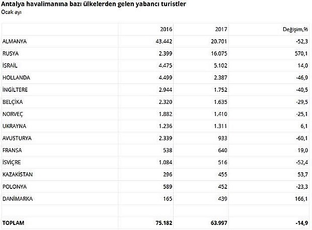 Antalya Havalimanı’na Ocak 2017’de gelen yabancı turist sayısında, Avrupa pazarlarındaki düşüş eğilimi devam ederken, Rusya pazarında toparlanma ve artış görüldü.