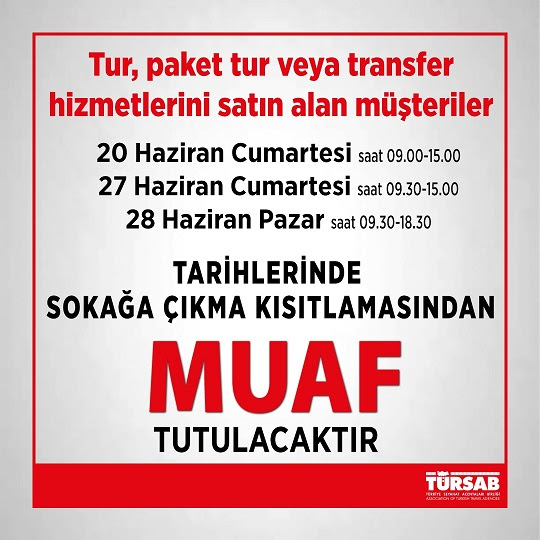 Başvurumuz sonucunda İçişleri Bakanlığınca tarafımıza yapılan resmi bildiri ile; seyahat acentaları tarafından organize edilerek ilgili tarihlerde gerçekleşecek olan tur, paket tur veya transfer hizmetlerini satın alan müşteriler ve bu hizmetlerin temin edilmesinde görev alan seyahat acentası çalışanlarının genelge ile bildirilen tarihlerde sokağa çıkma kısıtlamasından muaf olacağını bilgilerinize sunarız.