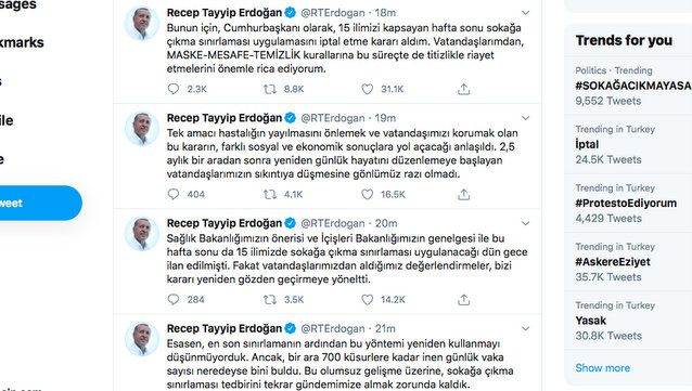 Cumhurbaşkanı Recep Tayyip Erdoğan, hafta sonu 15 ilde uygulanacak sokağa çıkma kısıtlamasına ilişkin Twitter hesabından açıklamalarda bulundu. Erdoğan, "15 ilimizi kapsayan hafta sonu sokağa çıkma sınırlaması uygulamasını iptal etme kararı aldım" açıklamasında bulundu.