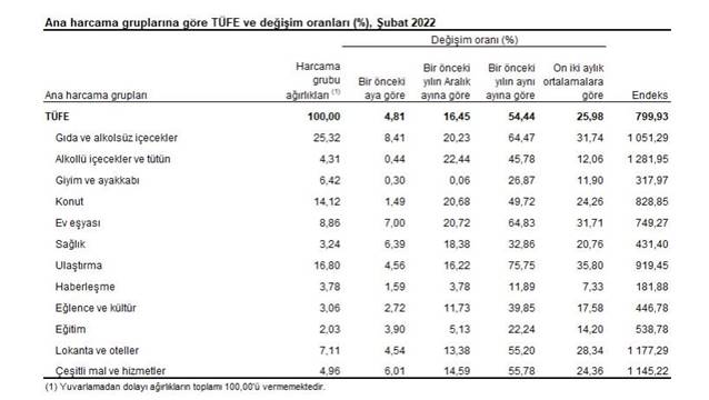 TÜFE 2022 yılı Şubat ayında bir önceki aya göre %4,81, bir önceki yılın Aralık ayına göre %16,45, bir önceki yılın aynı ayına göre %54,44 ve on iki aylık ortalamalara göre %25,98 artış gerçekleşti.