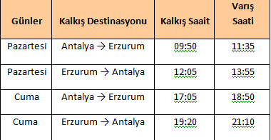 İlk uçuşu 2 Ocak’ta gerçekleştirilecek olan Antalya – Erzurum uçuşları her Pazartesi ve Cuma günü karşılıklı olarak gerçekleştirilecek.
