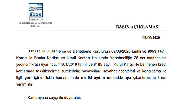 3 Haziran'da açıklanan Tatil Destek Kredisi paketi içinde yer alan Tatil Destek Kredi Kartı uygulaması BDDK tarafından hayata geçirildi. Bankacılık Düzenleme ve Denetleme Kurulu bugün yaptığı açıklamada kredi kartlarında taksitlendirme sürelerinin; havayolları, seyahat acenteleri ve konaklama ile ilgili yurt içine ilişkin harcamalarda on iki aydan on sekiz aya çıkarılmasına karar verildiği belirtildi. İşte o açıklama: